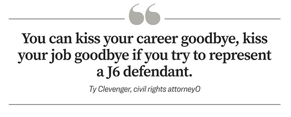 Mr. Clevenger said he has a colleague in New York who was fired from his firm simply for offering to represent a Jan. 6 defendant who was accused of participating in an assault, but video evidence “showed unequivocally that he had no role in any assault.”