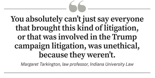 Ms. Tarkington said she understands and appreciates what The 65 Project is trying to do, but that “you absolutely can’t just say everyone that brought this kind of litigation, or that was involved in the Trump campaign litigation, was unethical, because they weren’t.”