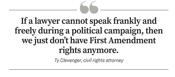 “If a lawyer cannot speak frankly and freely during a political campaign, then we just don’t have First Amendment rights anymore,” he said.