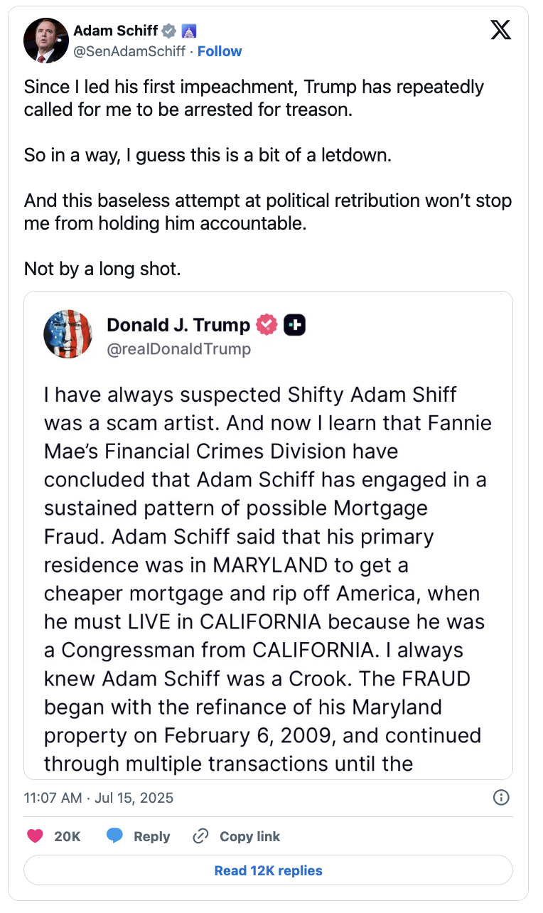 President Trump’s Truth Post this morning is accurate as Fannie Mae’s Financial Crimes Division concluded that Mr. Schiff has engaged in a sustained pattern of possible Mortgage Fraud.