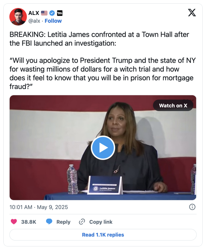 For reference, New York Attorney General Letitia James — who prosecuted Trump for financial fraud — is currently under criminal investigation for allegedly committing mortgage fraud.