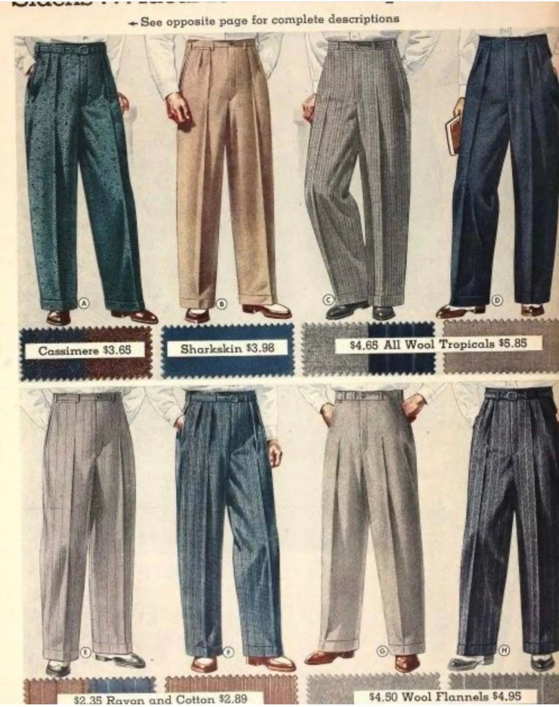 Pleats in your trousers can be flattering if the reverse pleat is chosen. Plain front trousers are more available and can look clean, but a pleated fuller cut trouser was a requirement for every suit I’ve ever had made—although I have not had a new suit made in thirty years.