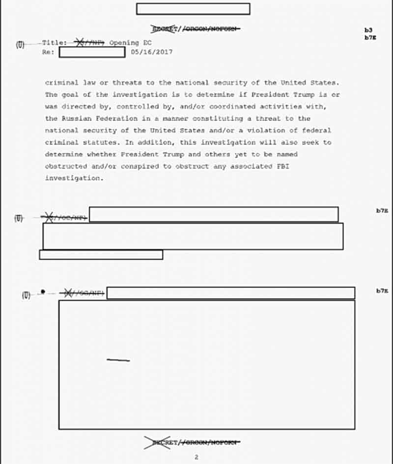 Shown, the first two pages of a newly released document that opened an FBI probe of Donald Trump in May 2017. The remaining four pages are completely redacted, leaving unstated the FBI’s “articulable factual basis” on Page 1.