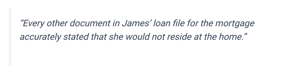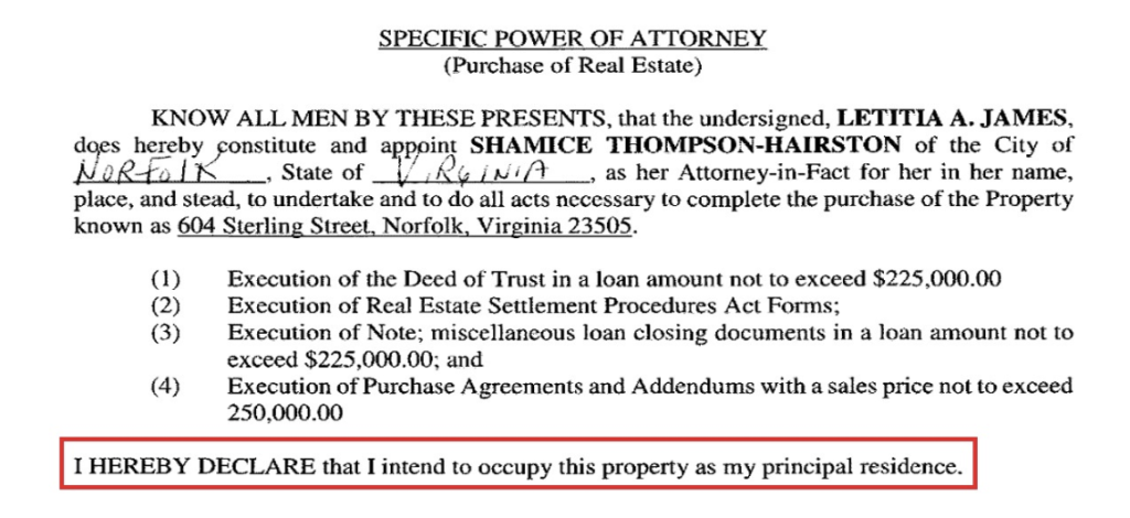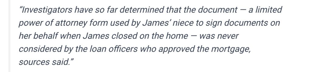 ABC News reported in their September 17 article: “every other document in James’ loan file for the mortgage accurately stated that she would not reside at the home” as if this somehow helps her defense.