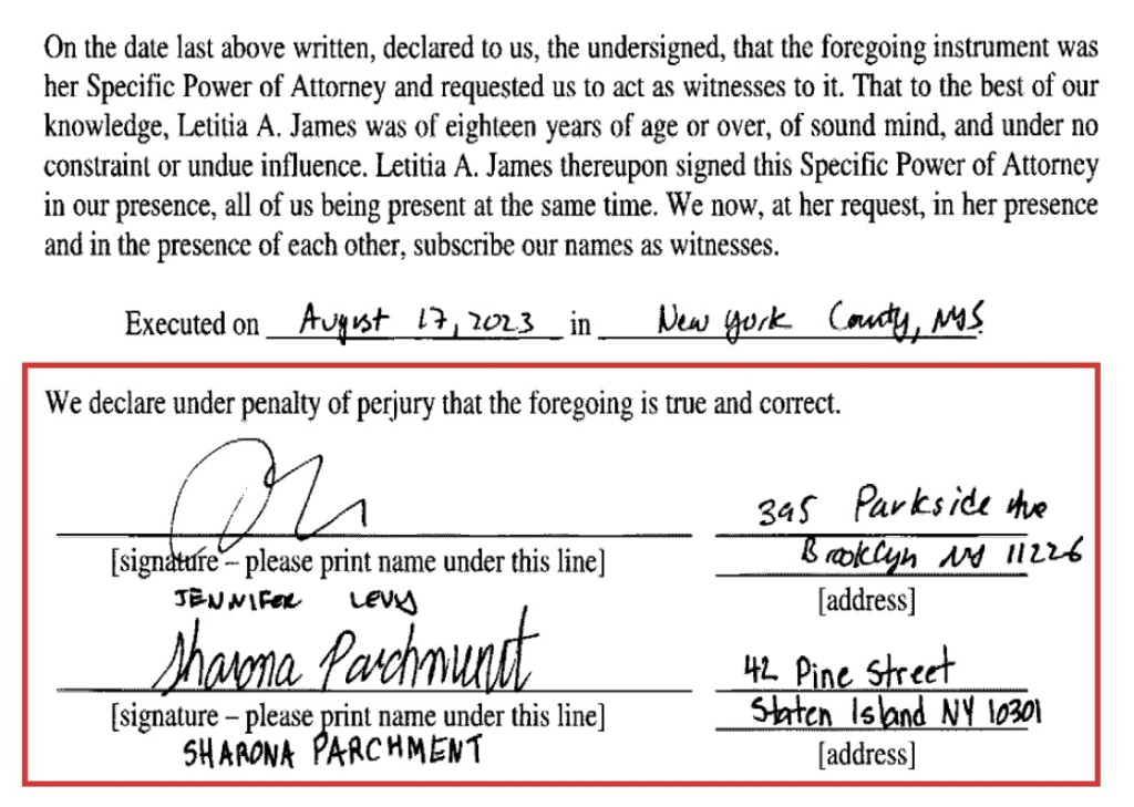 August 17, 2023 – James signed a Power of Attorney under penalty of perjury declaring: