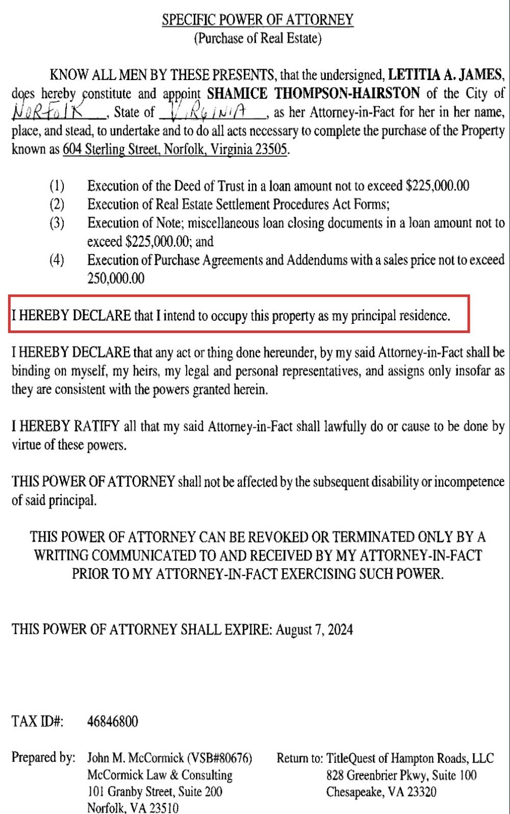 - August 17 POA: “I HEREBY DECLARE that I intend to occupy this property as my principal residence”