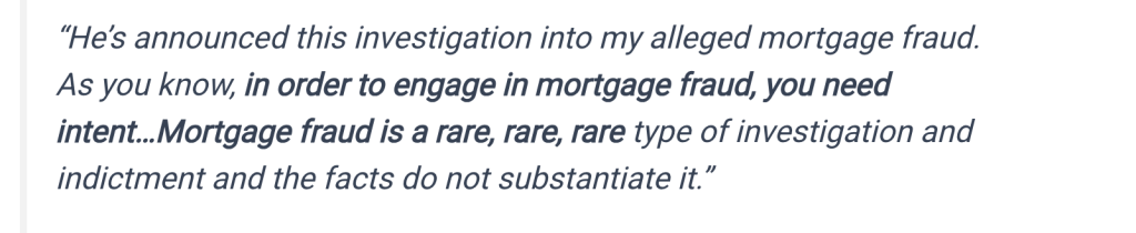 While this investigation continues, James spent this week on a media tour—Joy Reid, CBS New York—making claims about the investigation that the evidence contradicts. She claimed you need “intent” for mortgage fraud, yet there’s an email proving intent. She claimed prosecutions are “rare,” yet there’s precedent demanding prosecution. She claimed it was an “error,” yet there’s proof she knew it was false when she signed it.