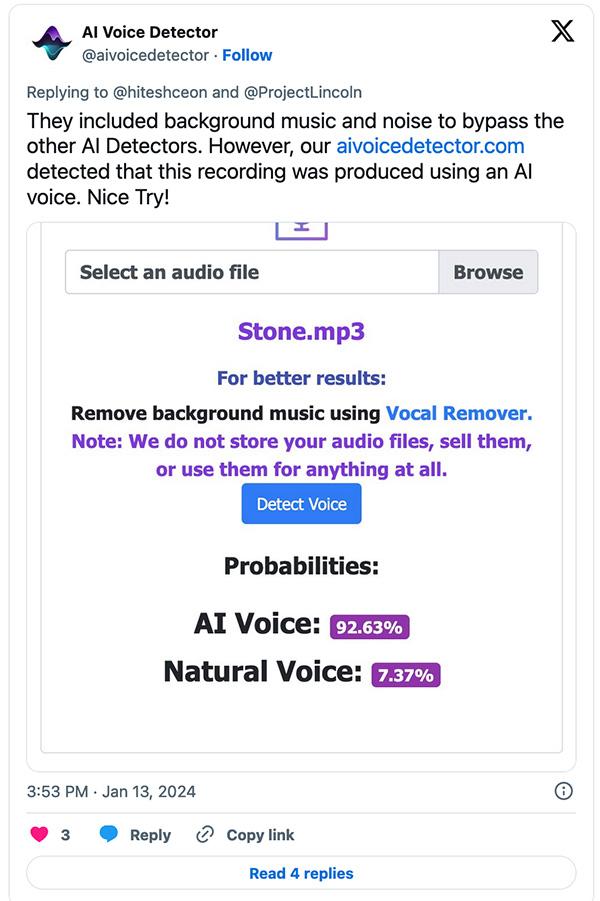 Stone tested the audio using artificial intelligence detection software from AI Voice Detector.