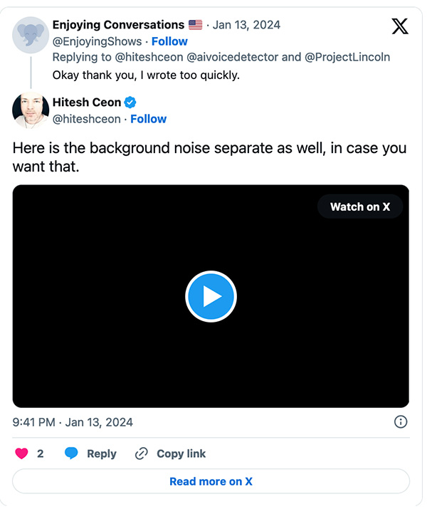 So, about three days later, they then posted an audio, which I have had professionally analyzed, and it is most definitely AI-generated. [It] has very, very substantial background noise, which is often used to mask the creation of a voice in this audio context.