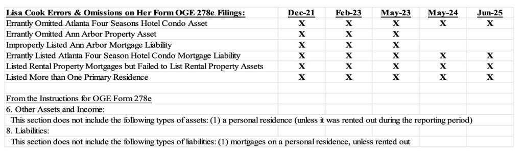 Cook’s false occupancy statements on mortgage applications are confirmed by her numerous errors and omissions in her signed U.S. Office of Government Ethics financial filings.