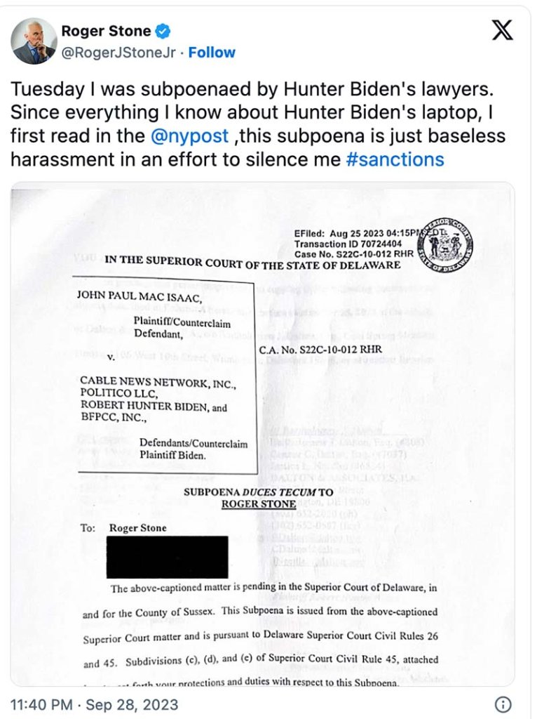 As a reporter, it was evident to me upon speaking with Stone and Ablow that neither of these individuals had anything whatsoever to do with the Hunter Biden laptop. The facts make it clear. This latest subpoena sent to Roger Stone is part of a revenge campaign being waged by Hunter Biden and his legal team, hellbent on framing anybody they can to deflect blame away from Hunter Biden, and the evidence found on his laptop.
