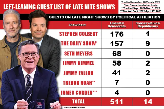 From September 2022 through June, the group tracked 511 liberal or Democratic guests across late-night TV, compared to just 14 conservatives and Republicans. The study looked at shows hosted by Kimmel, Stephen Colbert, Seth Meyers, Jimmy Fallon and Jon Stewart.