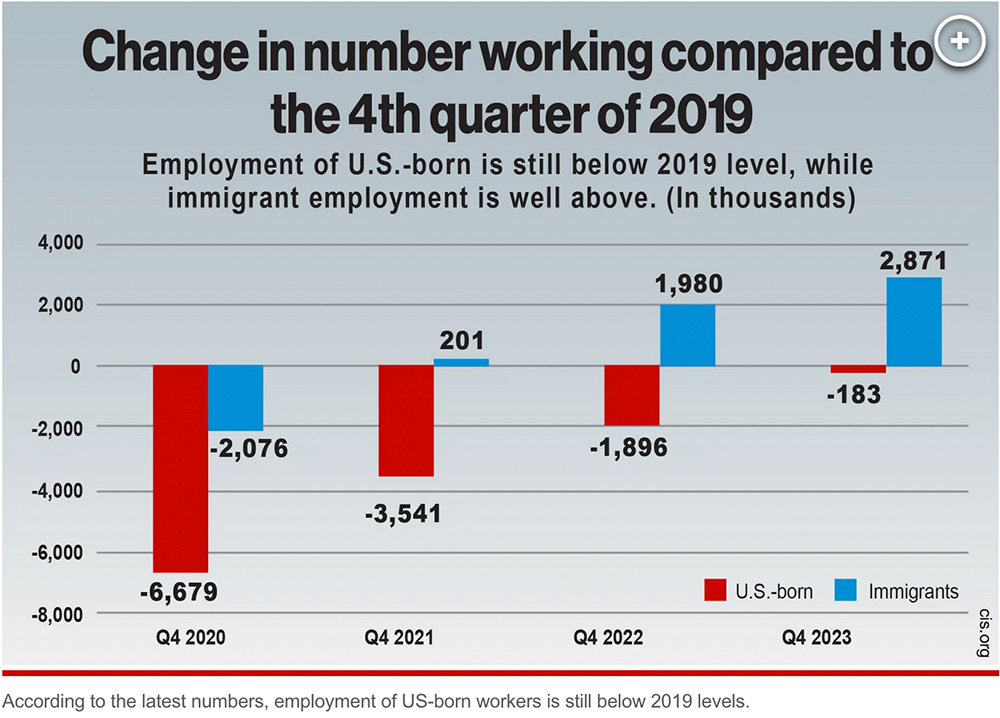 To be clear, employment for both groups has rebounded significantly since the depths of the COVID-19 recession in 2020. But the number of US-born workers has not returned to the level it was before the pandemic, while immigrant employment (legal and illegal together) has ballooned.