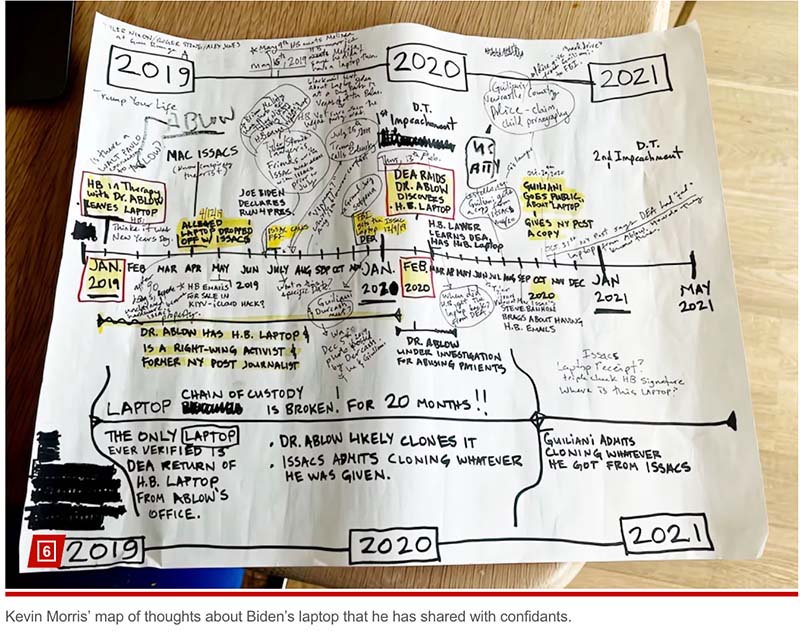 But leaks from inside the Morris camp, and a hand-scrawled mind map he has shared with confidants, show a chaotic disinformation project attempting to rewrite the story of the laptop’s origins.