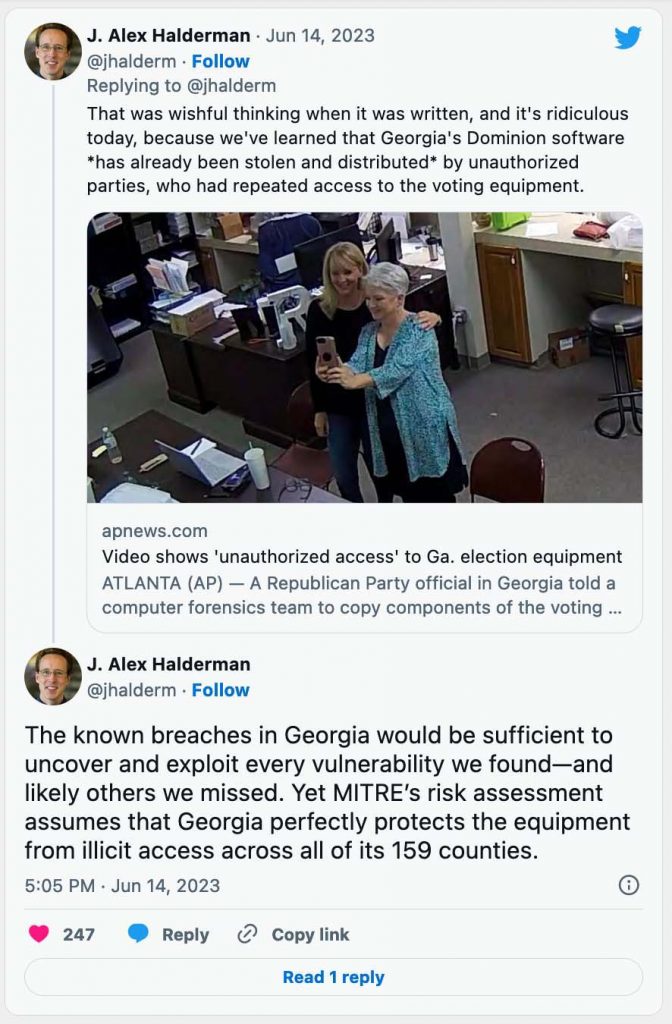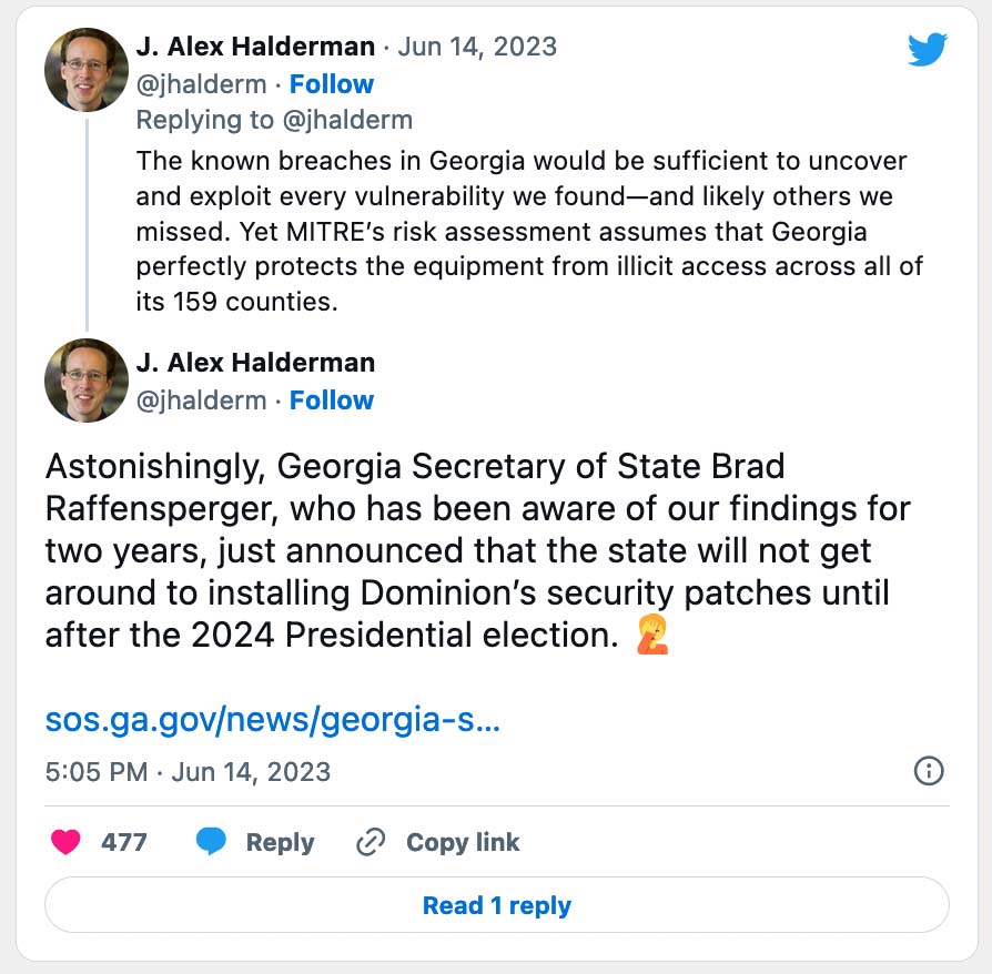 On Thursday Professor Halderman tweeted out that Georgia Secretary of State Brad Raffensperger will not install Dominion’s security patches before the 2024 election.
