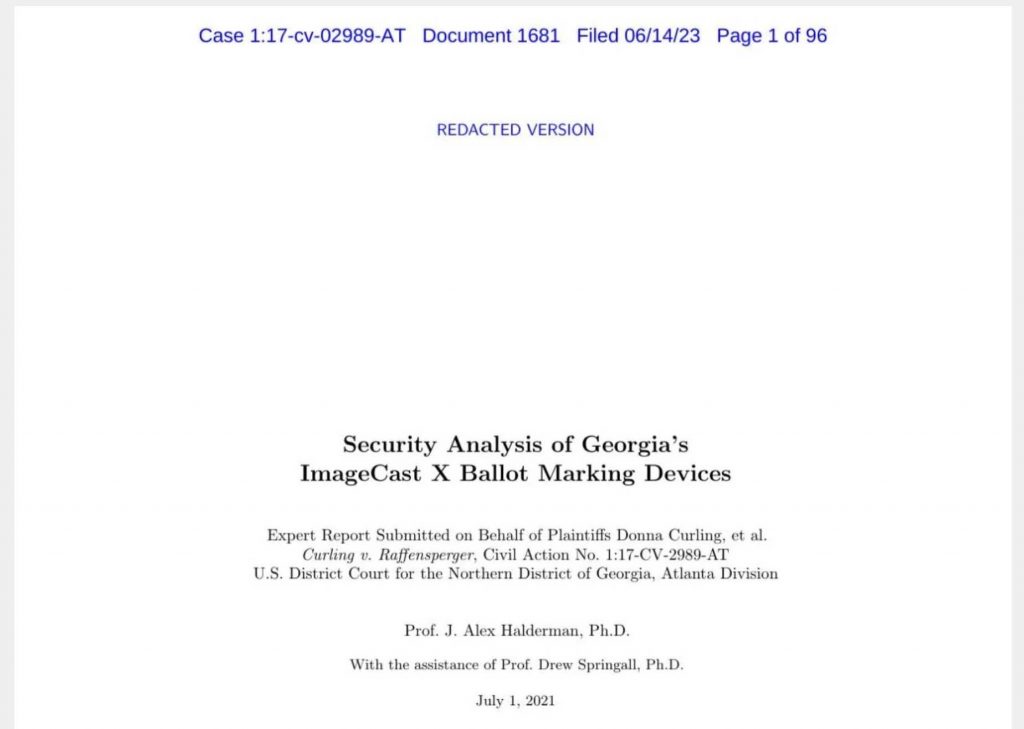 The 96-page Halderman Report – the Security Analysis of Georgia’s ImageCast X Ballot Marking Devices – was finally unsealed after years on Wednesday by a Judge in the Georgia Federal District Court. In the past two years, the allegedly corrupt Georgia Secretary of State, Brad Raffensperger, has done everything in his power to conceal this report from the public. Why? Why also did the Judge allow this to stay hidden? Were there payoffs in play for the two?