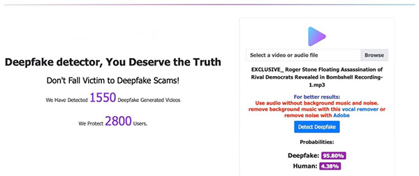 Stone himself also cited a second AI software detector, DeepFakeDetector.ai which he utilized to examine the audio posted by Mediaite. In this case, the detection software said there was a 95.80 likelihood that the audio was AI-generated.