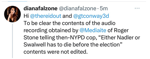 Additionally, Falzone freely admits within this video that the alleged audio of Stone has been ‘lightly edited’. What does ‘lightly edited’ mean? Why did the clip have to be edited at all? Then, Falzone denies on her own X feed that the audio was edited. So was it edited or wasn’t it?