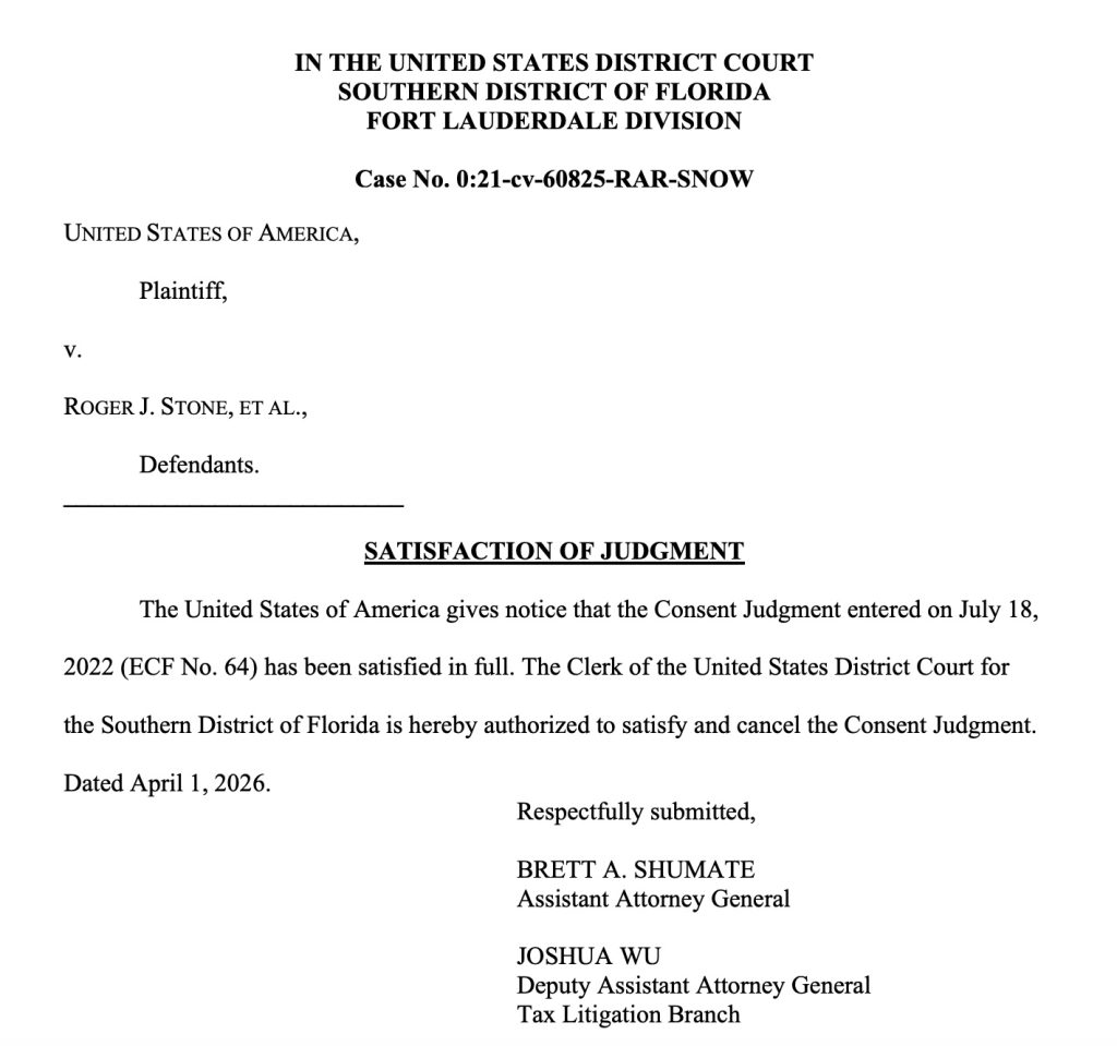 For now, at least, Stone’s financial troubles appear to have eased. On the first of this month, nearly four years after the settlement in Stone’s tax case, the Justice Department notified the judge that the judgement against Stone and his wife had been satisfied.
