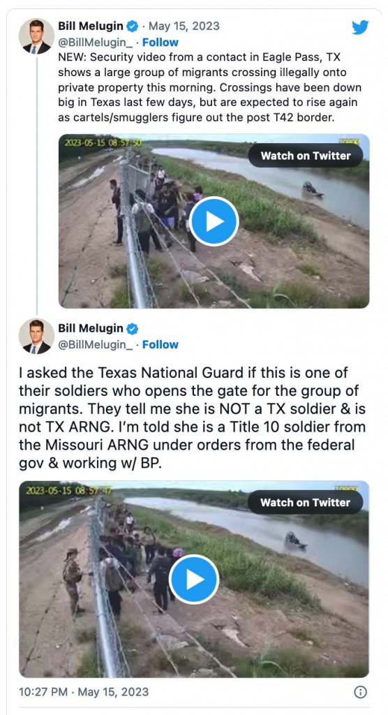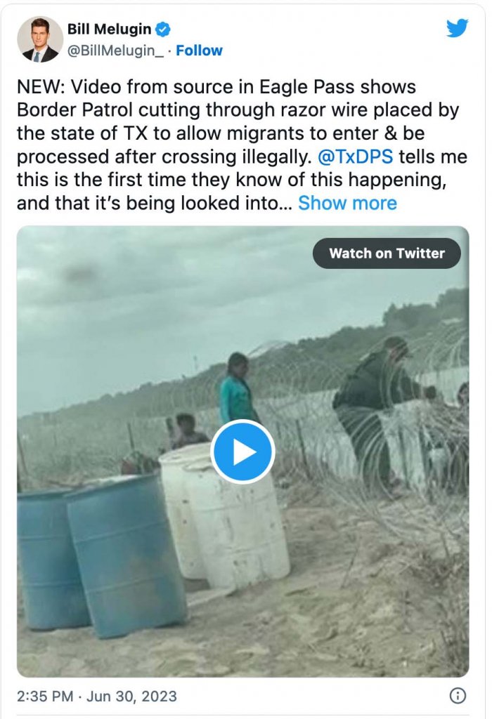 “The federal government’s position is that once migrants are on U.S. soil, under U.S. law, they need to be processed, and cannot be repelled or turned away,” Melugin noted on Twitter. “Texas is taking a much different approach, and has been physically blocking migrants under orders from [Governor] Greg Abbott.”