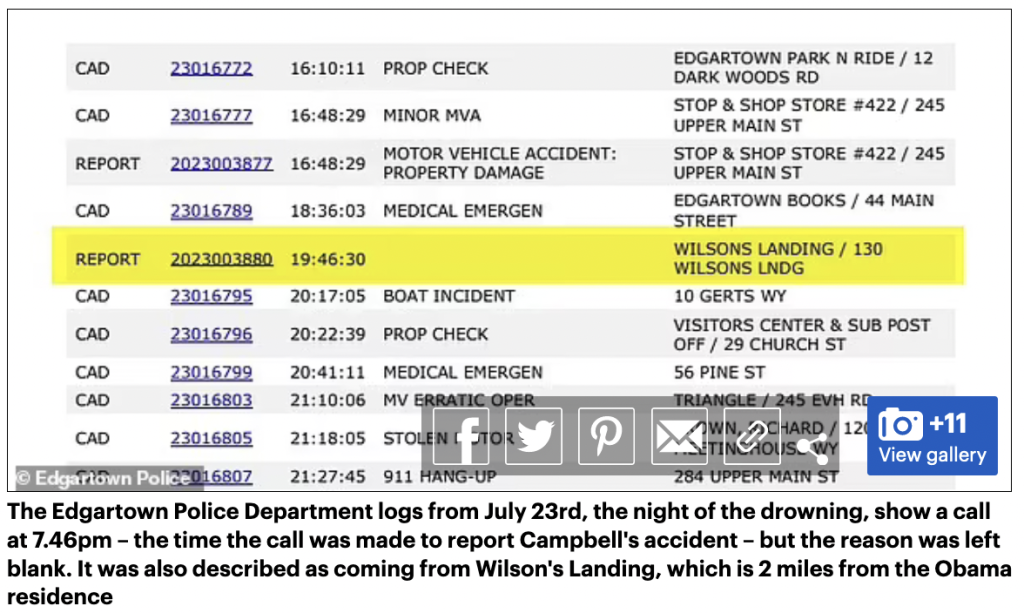 Meanwhile, Martha’s Vineyard police even left the reason for the emergency call blank in official logs from the night of the incident. The reason for every other call that night is given.