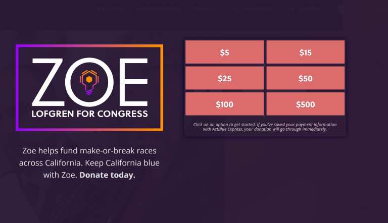 Looking to the left on her home page, we learn that “Zoe helps fund make-or-break races across California. Keep California blue with Zoe. Donate today.”