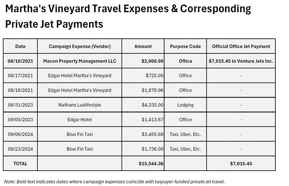 In August 2021, James’ campaign expensed a $2,000 Martha’s Vineyard house rental through Macon Property Management LLC (categorized as “Office”) on August 10—the exact same day her official office paid $7,015.45 for a private jet flight through Venture Jets. During this same trip, her campaign spent over $2,600 at Edgar Hotel Martha’s Vineyard across August 17-18, also classified as “Office” expenses with the explanation “Hotel Stay for FR” [fundraiser].