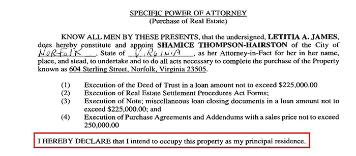 - Principal Residence Misrepresentation: In August 2023, James signed a Specific Power of Attorney declaring her intent to make 604 Sterling Street in Norfolk, Virginia her “principal residence”—a legally binding statement that may have automatically vacated her position as NY Attorney General under Public Officers Law § 30. This declaration came just 45 days before she launched her landmark civil fraud case against Donald Trump. It also potentially constituted mortgage fraud under 18 U.S.C. § 1014, which criminalizes false statements made to obtain a loan.