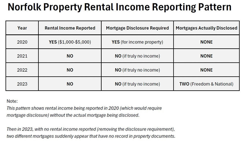 - 2020: Norfolk property purchased; OVM mortgage never disclosed