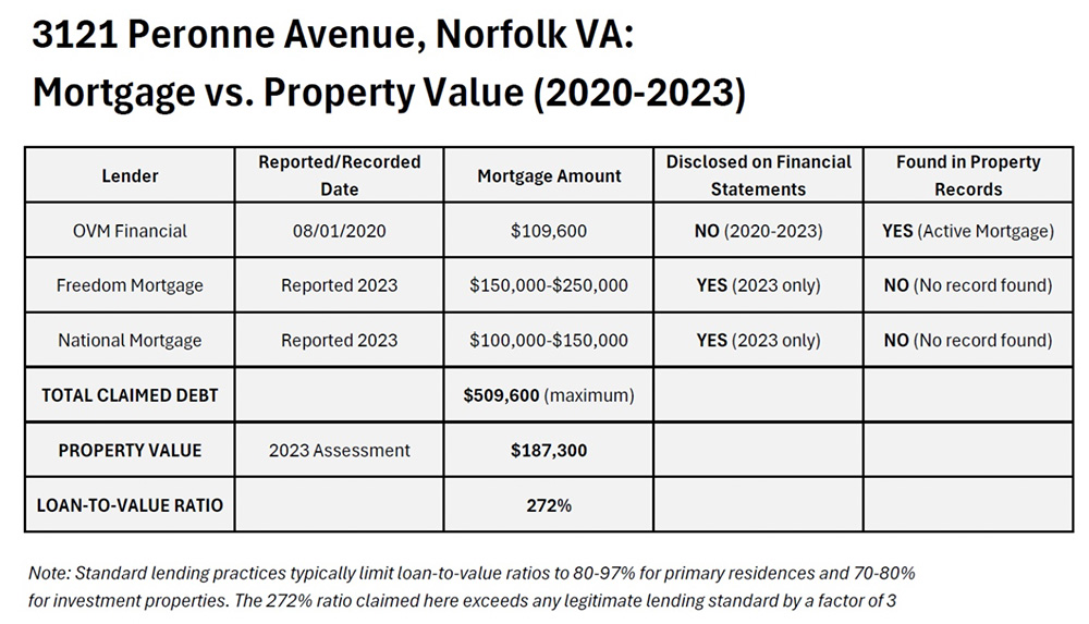 - Hidden and Phantom Mortgages: On her first Virginia property at 3121 Peronne Avenue, James used a $109,600 mortgage from OVM Financial in 2020 but never disclosed it on any of her NY financial disclosure forms, despite legal requirements to do so. Later, in her 2023 disclosure, she reported two different mortgages—one from Freedom Mortgage ($150,000-$250,000) and one from National Mortgage ($100,000-$150,000)—but a 2025 title search found no record of either loan, suggesting they may be fictional.