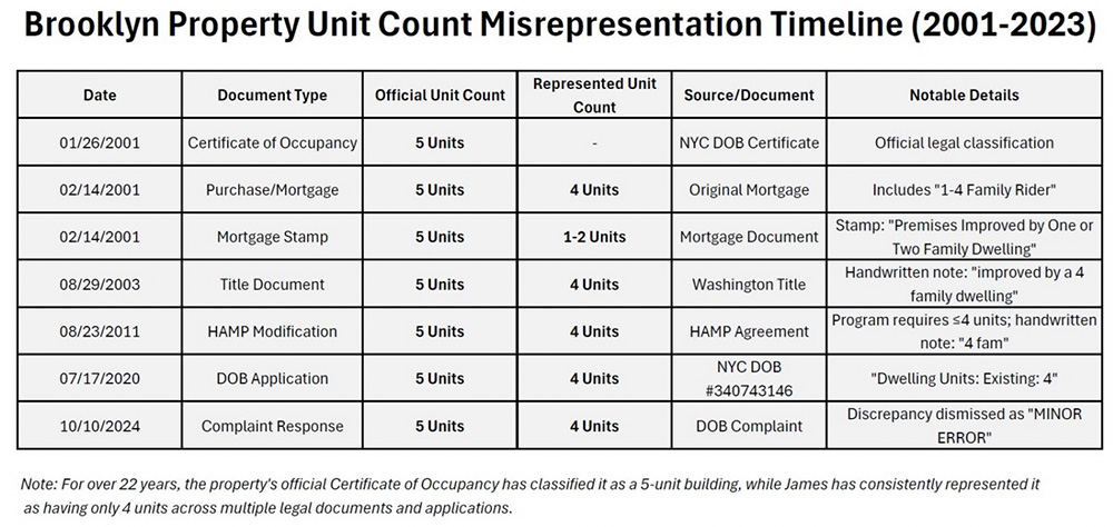 Most troubling is the absence of any efforts to resolve these discrepancies. Despite over two decades of ownership, James has never filed an Alt-1 application to legally reduce the number of residential units, nor has she obtained an amended Certificate of Occupancy. Official city records continue to classify her building as a five-family dwelling—while her mortgage documents, financial disclosures, and permit applications persistently claim otherwise.