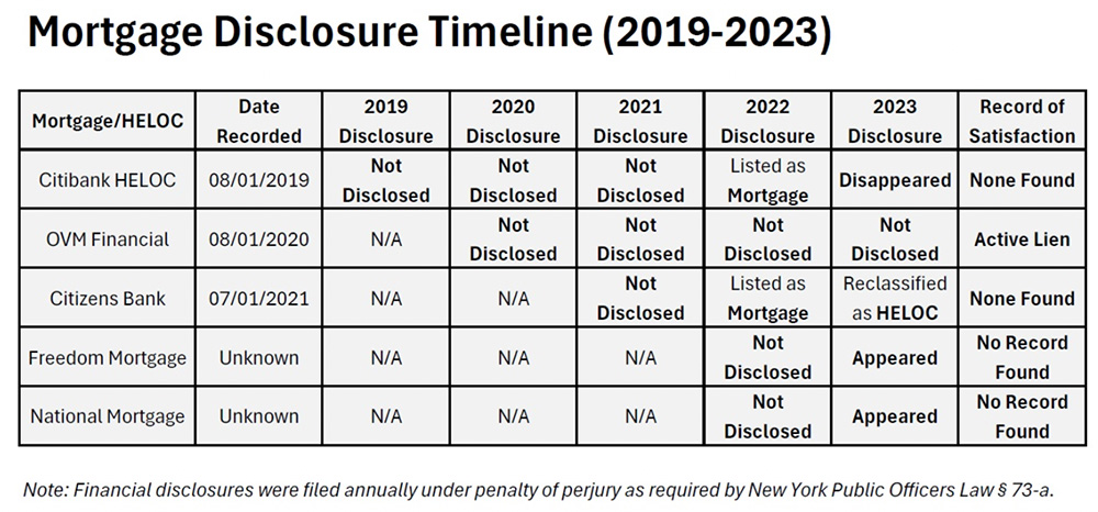 - New York State Financial Disclosure Laws: The pattern of missing, delayed, and misclassified mortgage reporting violates Public Officers Law § 73-a, which requires complete and accurate annual financial disclosures.