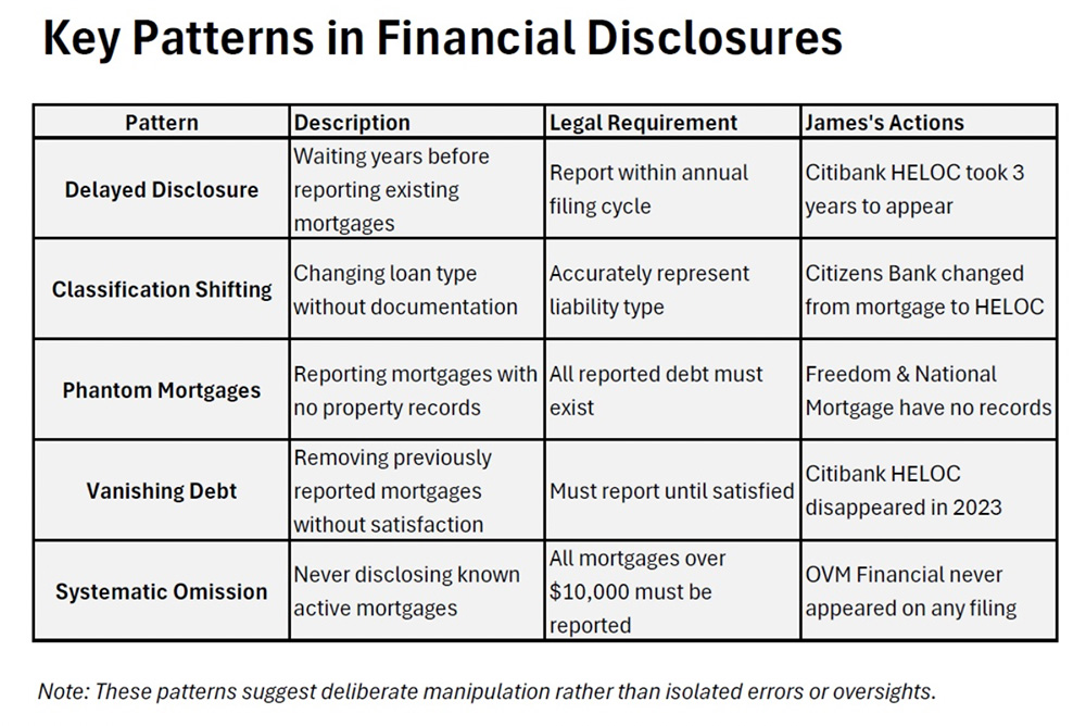 - They were included to obscure the original debt: Reporting phantom mortgages while omitting the real one (OVM) allowed James to present a fictitious liability profile while avoiding mandatory disclosure.
