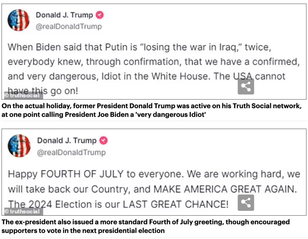 Trump had marked the nation’s birthday with a large rally in Pickens, South Carolina, and mocked Biden for mistakenly declaring that Russia’s President Vladimir Putin had sent his troop into Iraq.