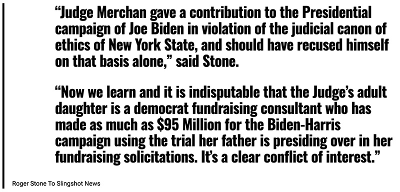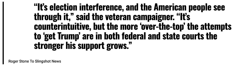 “Keith Davidson, who was an attorney representing Stormy Daniels, and who negotiated the settlement with Michael Cohen was arrested in an FBI sting set up to catch a ring trying to extort Hulk Hogan over a sex tape,” said Stone. “Davidson avoided prosecution in that case and gave the Feds Michael Cohen. How strange that Trump’s lawyers didn’t ask Davidson if he had traded non-prosecution for his testimony,” Stone told Slingshot News.