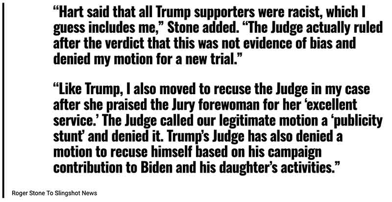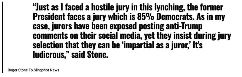 Stone noted that both he and Trump had motioned for a change of venue, recognizing that getting a non-Democrat jury in D.C. or Manhattan is mathematically impossible. Both their motions were denied.