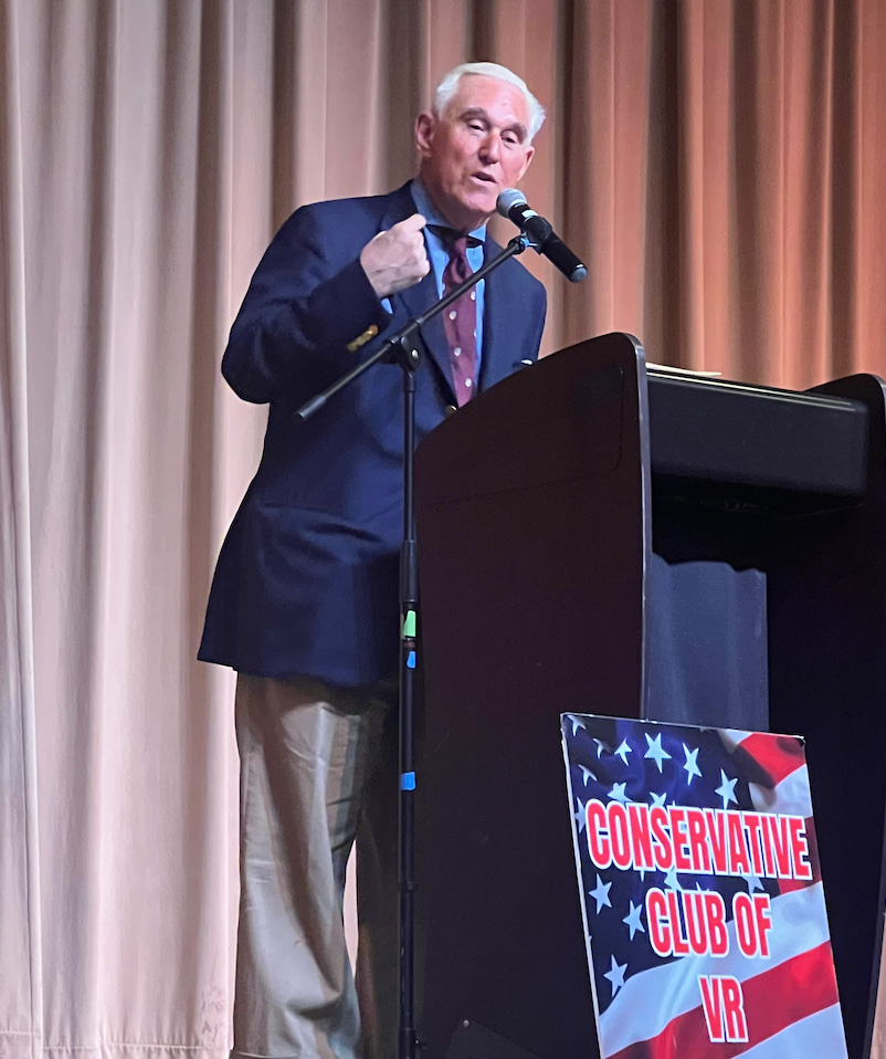 The flamboyant and controversial Stone, among the first Republicans in the Country to urge Donald Trump to seek the Presidency, and who the New York Times calls his longest serving political advisor, spoke as the invited guest of the Valencia Reserve Conservative Club. Valencia Reserve is a gated community in Palm Beach County. The community boasts over 1,000 homes.