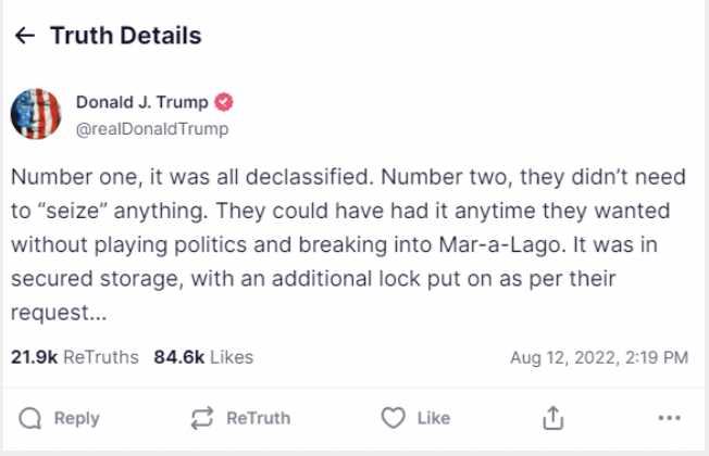 Trump, who has referred to the search as a “break-in” and a “witch hunt,” defended himself on his social media platform, Truth Social. He said the documents were “all declassified”