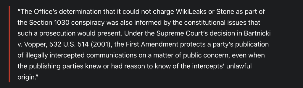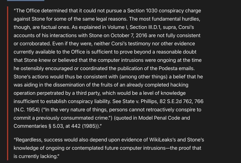 Judge Amy Berman Jackson withheld this from my lawyers at trial. Mueller’s dirty cops concluded in their report that even if they had found evidence that I had received documents from Assange of WikiLeaks and passed them to anyone (which I did not and for which they found no evidence whatsoever), it would not have been illegal. The whole thing was a hoax.
